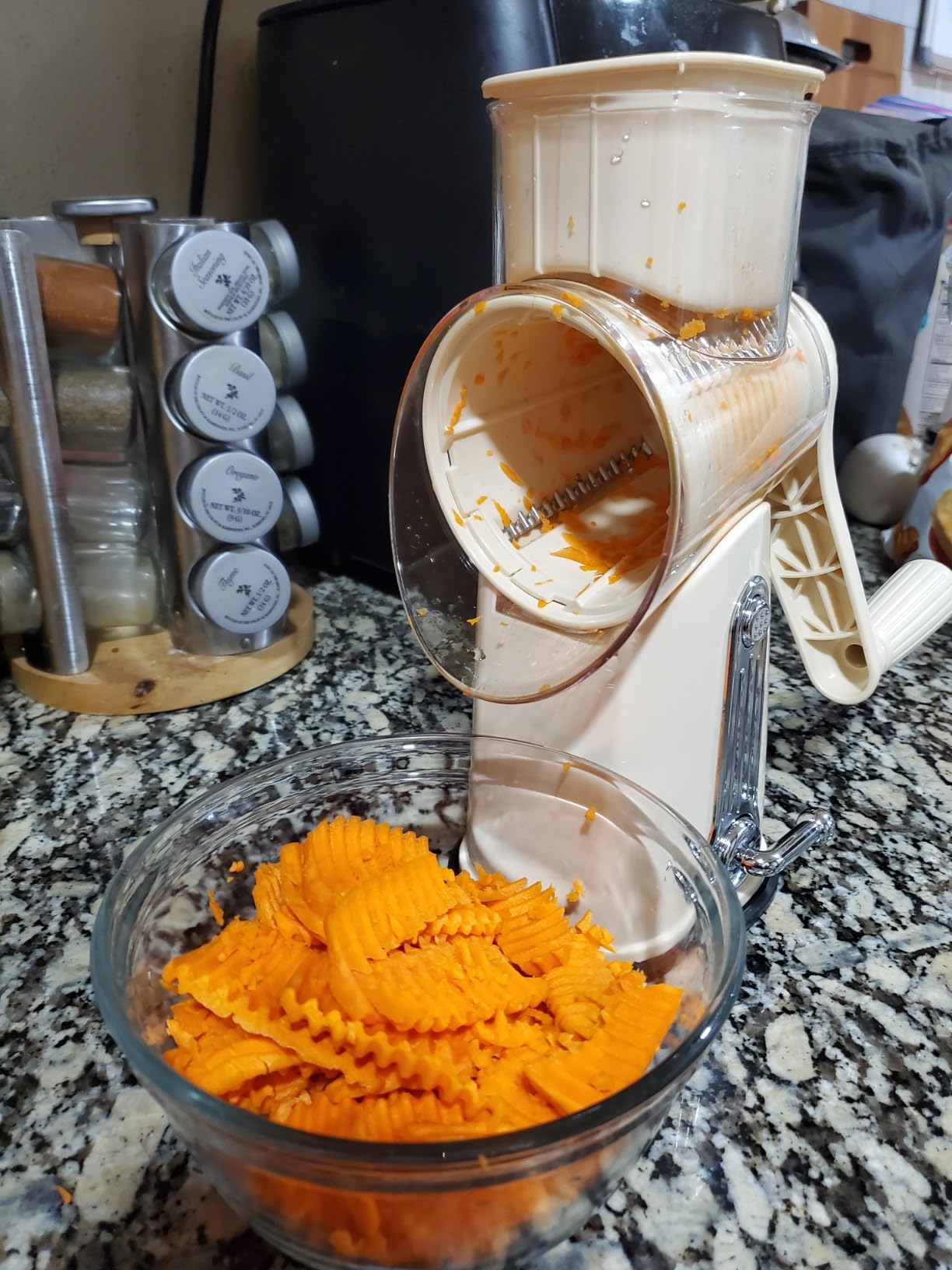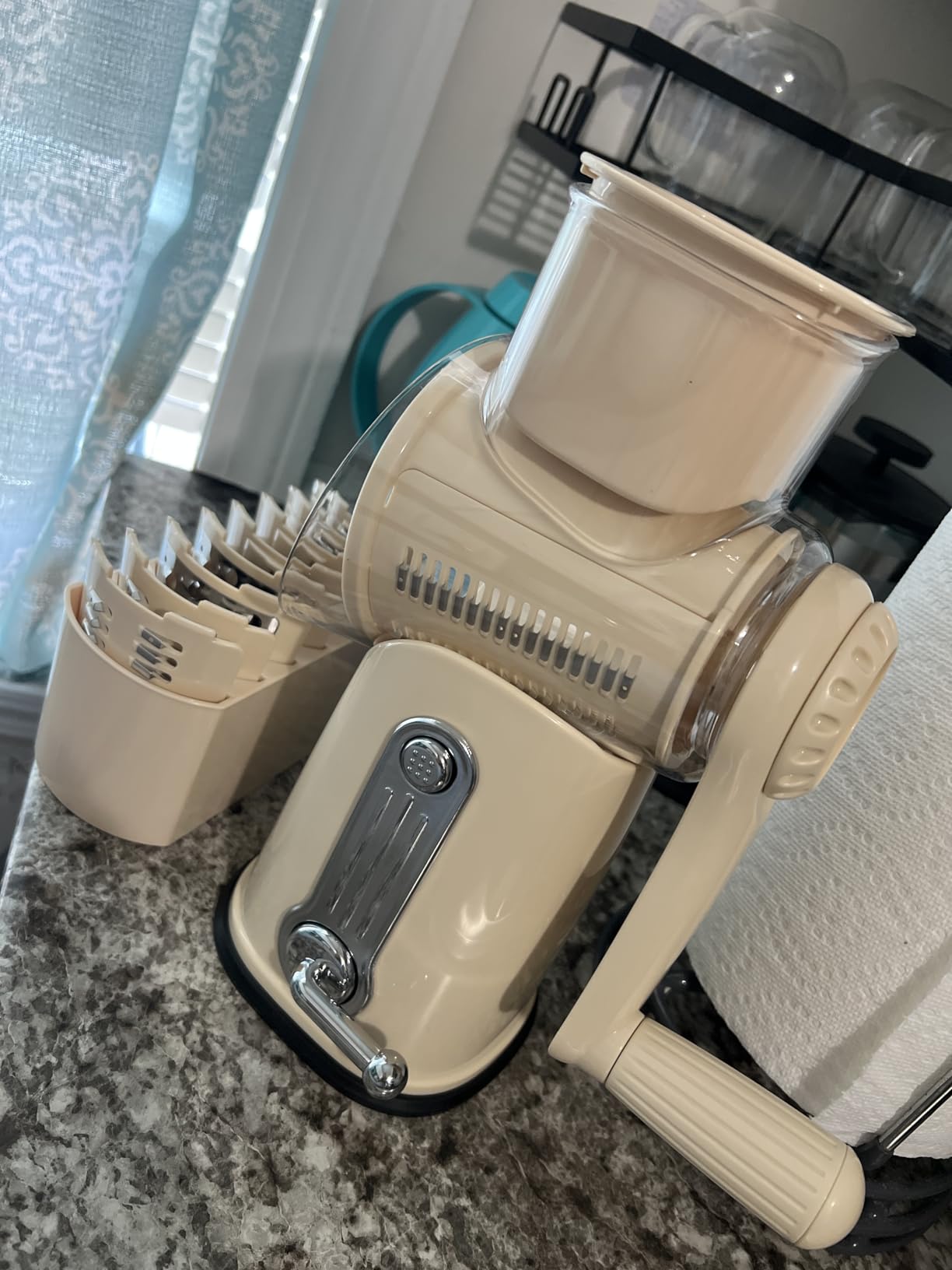 The rotary drum multiplies force with every turn, so hard cheese, carrots, and nuts shred effortlessly. What used to take pressure and patience now takes a few smooth cranks.
