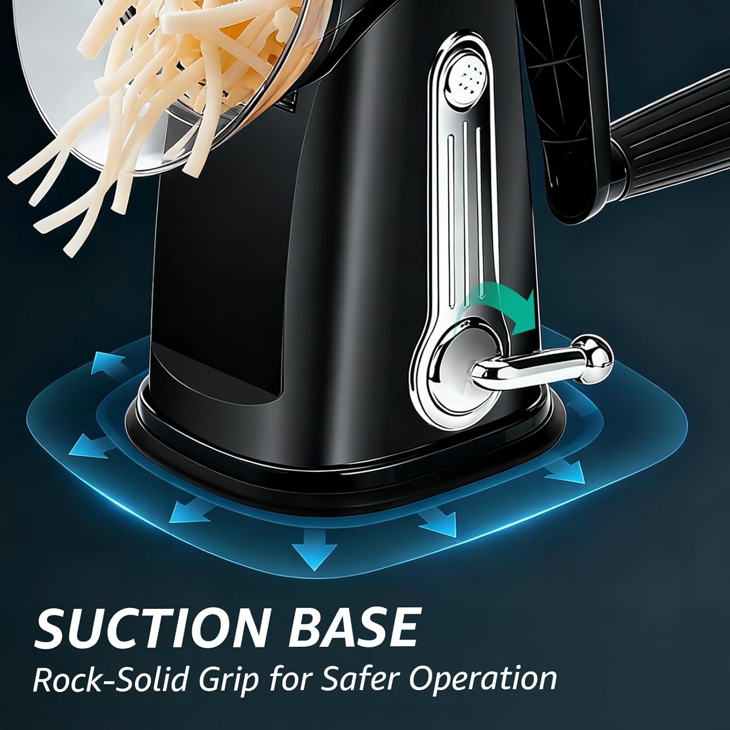 A powerful suction base anchors the grater in place. Twist, grate, release—no wobble, no chasing tools across the counter.